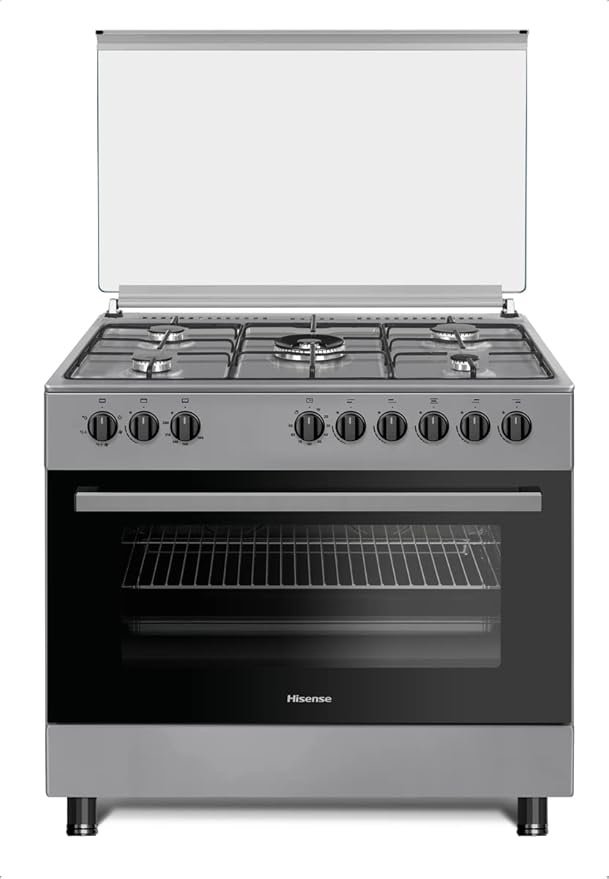 Hisense HFG90335RX 90 cm Freestanding Gas Cooker, 5 Gas Burners with Flame Failure Device, Cast Iron Pan Support, Auto Ignition, Stainless Steel