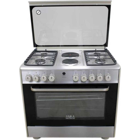 IQRA 90x60cm, 4-Gas Burners & 2 Electric Plates Cooker, Auto Ignition, Electric Oven, Dual Fan, Grill & Rotisserie – Stainless Steel
