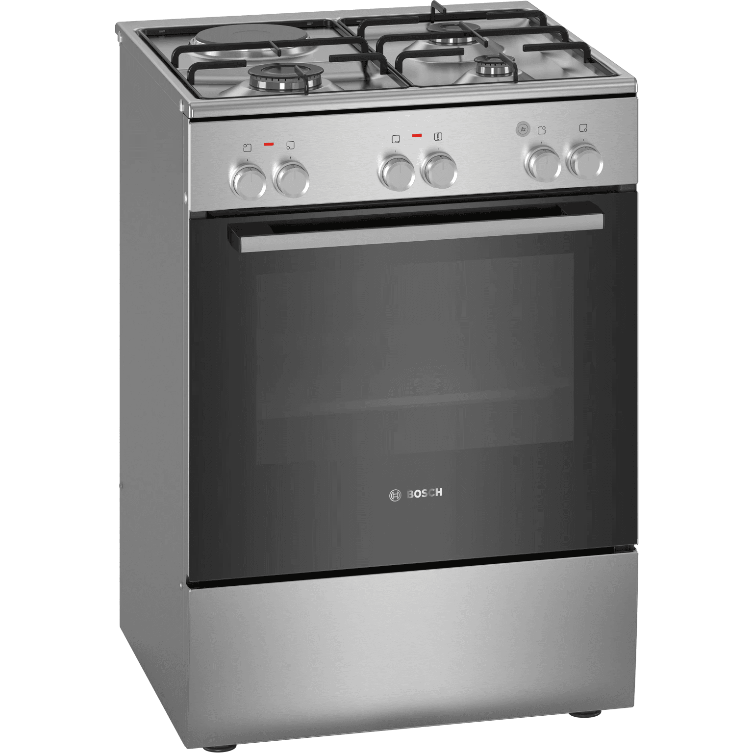 The Bosch HXA050F50S 60×60 cm Cooker is a practical freestanding dual-fuel cooker that combines the power of gas burners with an electric oven, providing flexible cooking for modern kitchens. Its stainless steel finish offers durability and a professional look while remaining easy to clean.