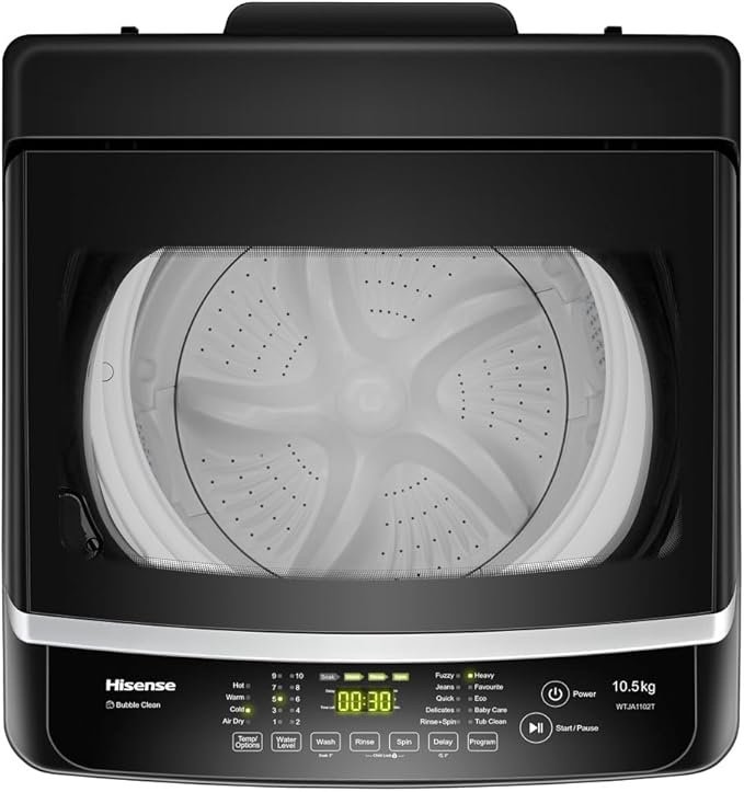 Smart laundry features make this Hisense top loader both efficient and convenient: Smart Fuzzy Logic senses load size and fabric type to adjust water usage and wash parameters automatically, helping save water and energy; Smart Memory saves your preferred settings; and Power‑Off Memory ensures your wash resumes after an unexpected power cut. A Tub Clean cycle helps maintain drum freshness, while Bubble Clean and 3D Windmill Impeller technology work together to penetrate fabrics more deeply and help lift stubborn stains.