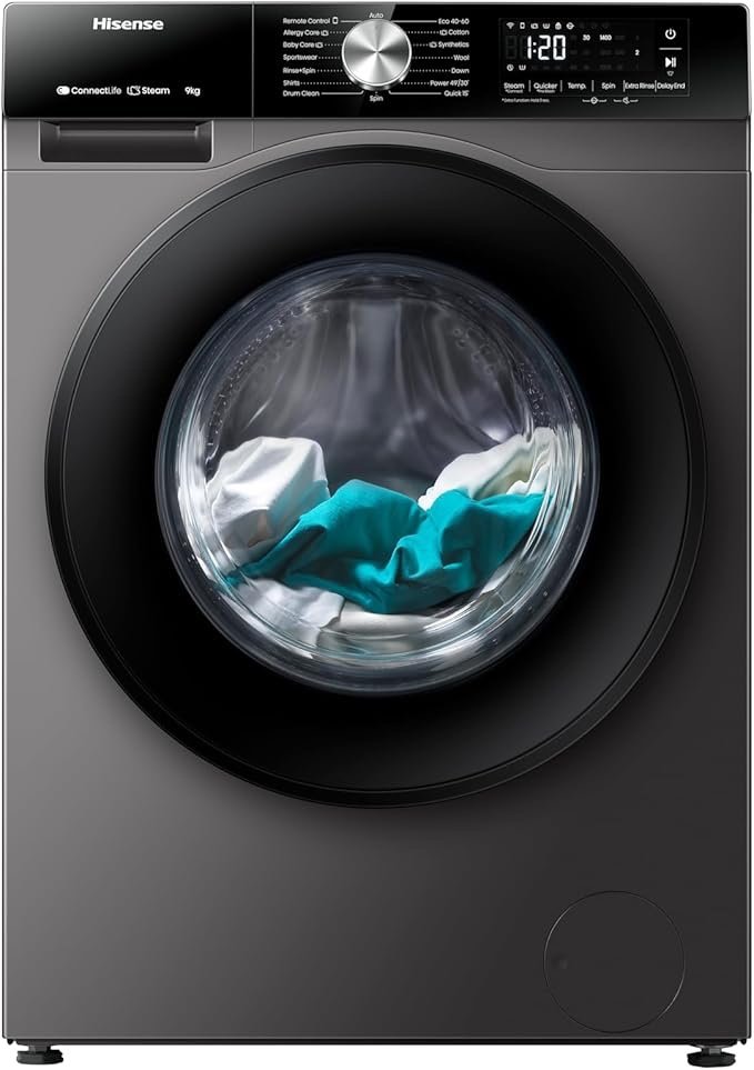 Hisense WF3S9043BT 3S Series 9 Kg Washing Machine with Inverter Motor, Smart WiFi, 1400 RPM, 15 Programs, Auto Wash, Titanium Grey