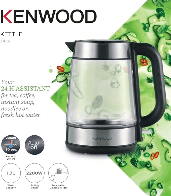 The Kenwood ZJG08.000CL Glass Kettle is a powerful and stylish cordless kettle that combines elegant design with efficient boiling performance. With a 1.7-litre capacity and 2200 W heating element, this kettle delivers hot water quickly — usually within about 3–4 minutes for a full boil — making it perfect for daily tea, coffee, hot chocolate, instant noodles and more.