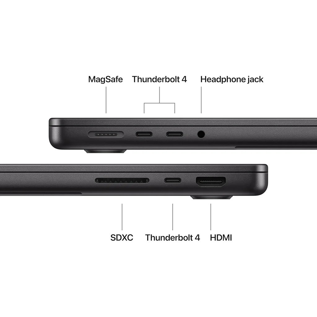 The MacBook Pro 14″ also provides a 1080p FaceTime HD camera and a high-quality audio system with spatial audio support — perfect for video calls, virtual collaboration, and content streaming. For connectivity and expansion, it offers multiple Thunderbolt/USB-4 ports, HDMI, SDXC card slot, and a headphone jack, giving you the flexibility to connect monitors, storage devices, and peripherals with ease.