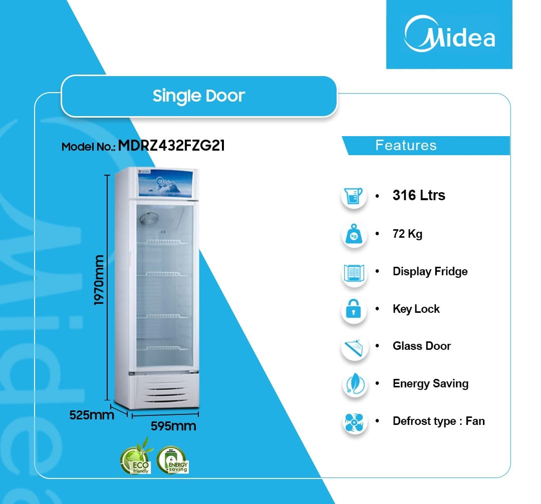 The Midea 400 L Single Door Display Refrigerator (Model: MDRZ432FZG21) is a spacious and versatile refrigeration solution designed for both commercial display needs and everyday household use. With an approximate 400 litre capacity, this upright display fridge offers generous room to store drinks, packaged foods, fresh produce, snacks and more — while keeping them visible and easily accessible without opening the door.